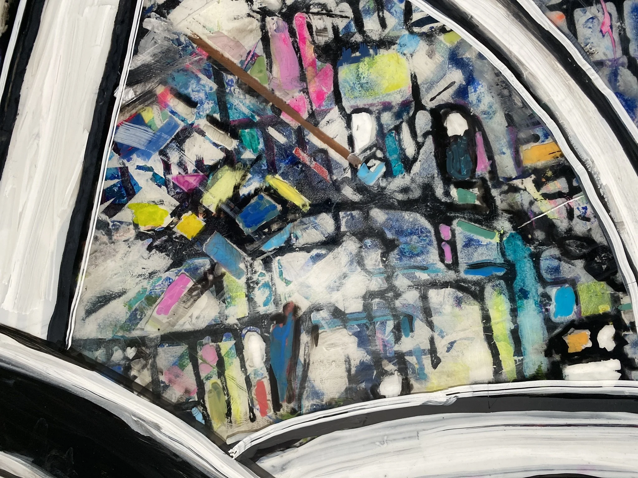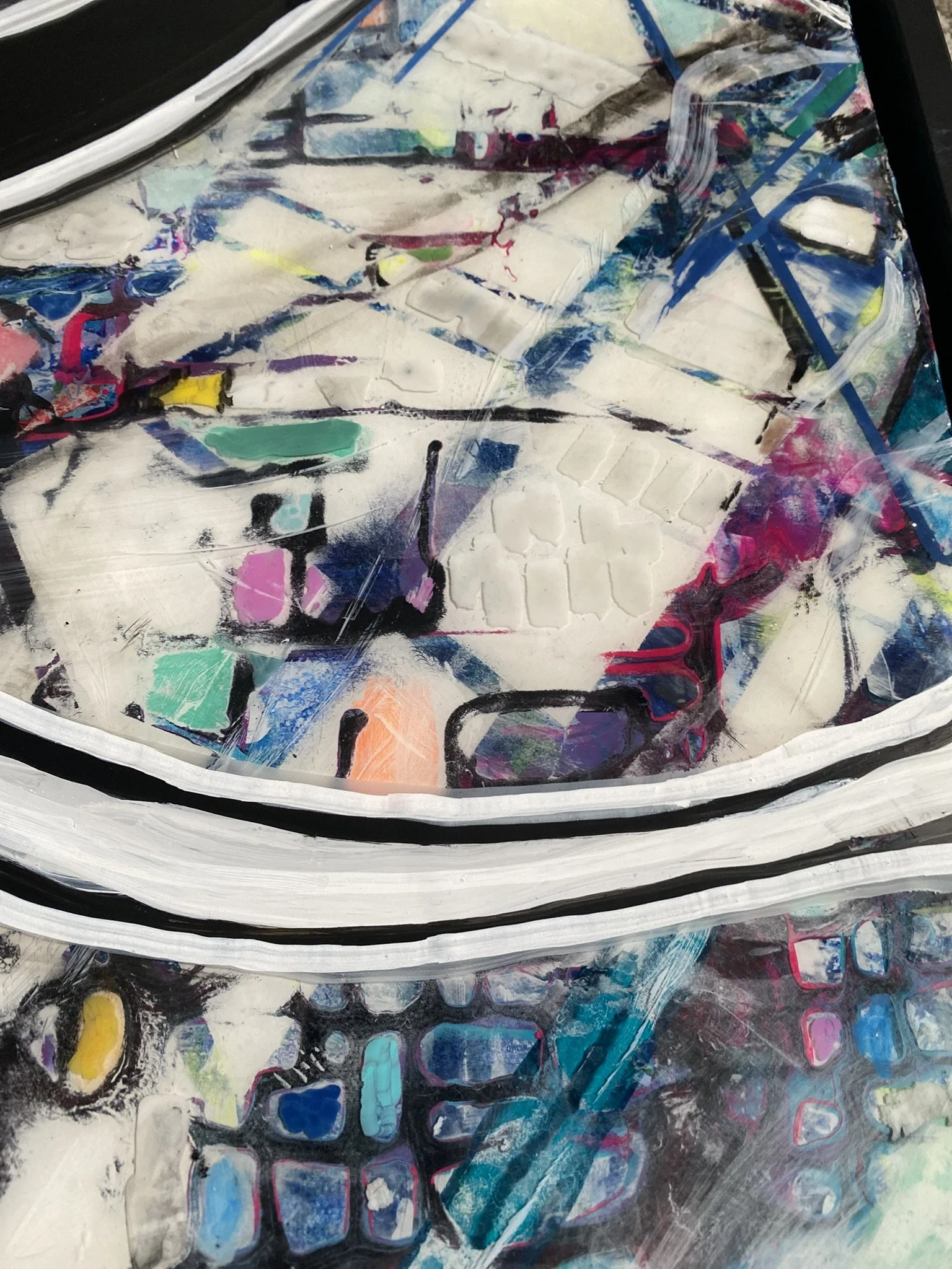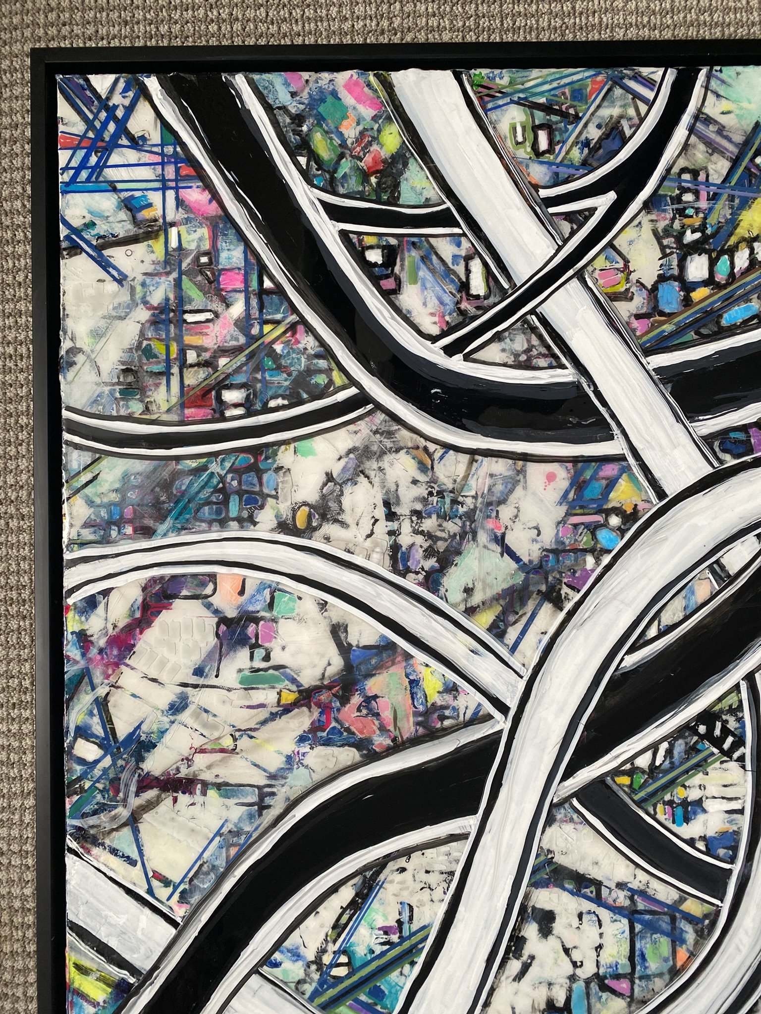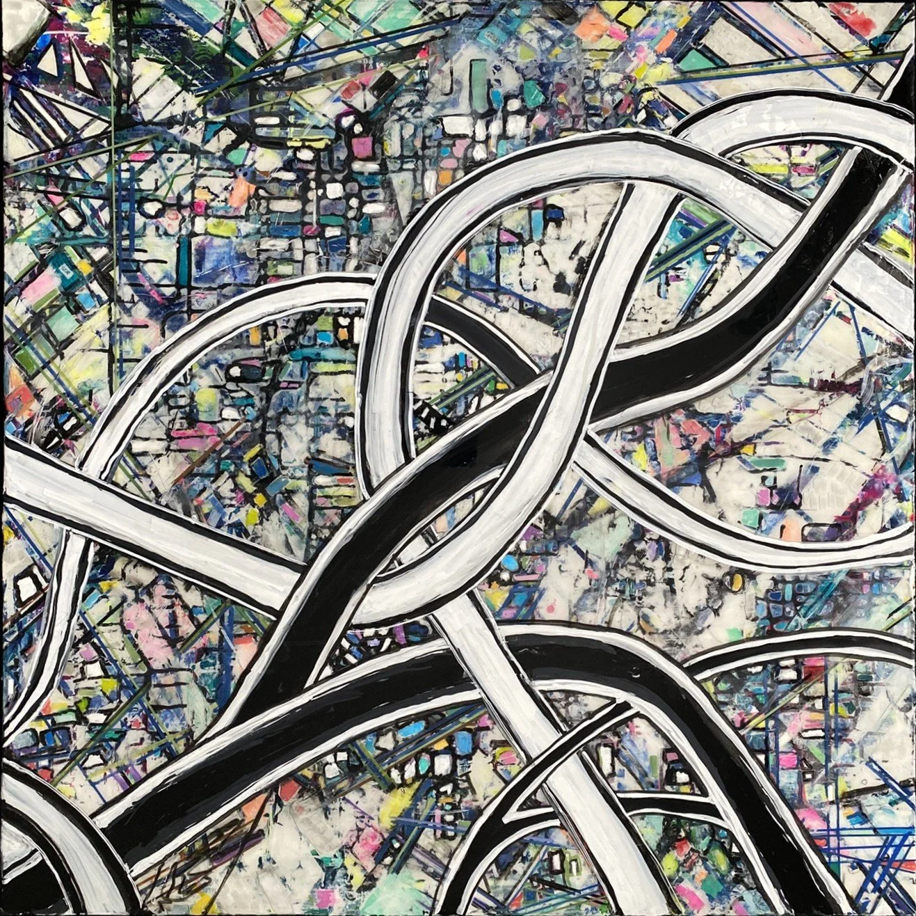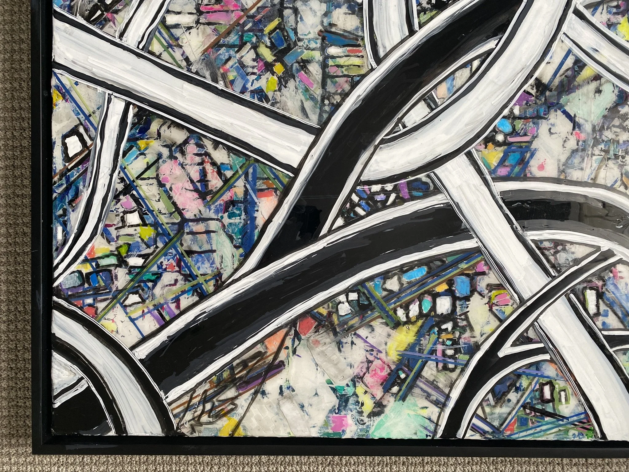 Complex mix of monochromatic highways and colorful city blocks make up this 36in by 36in framed and clear epoxied piece